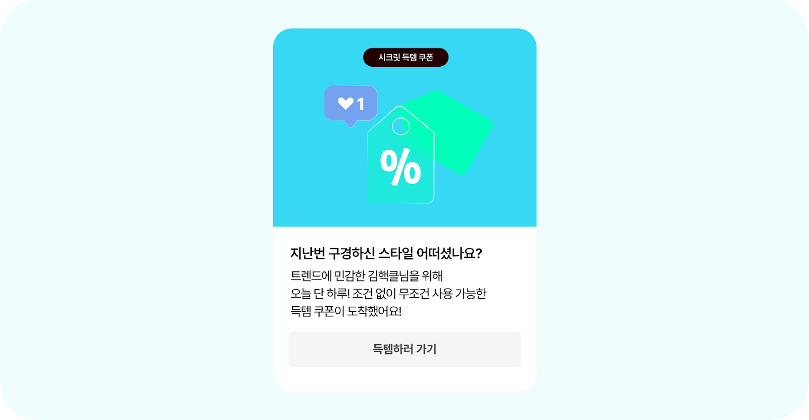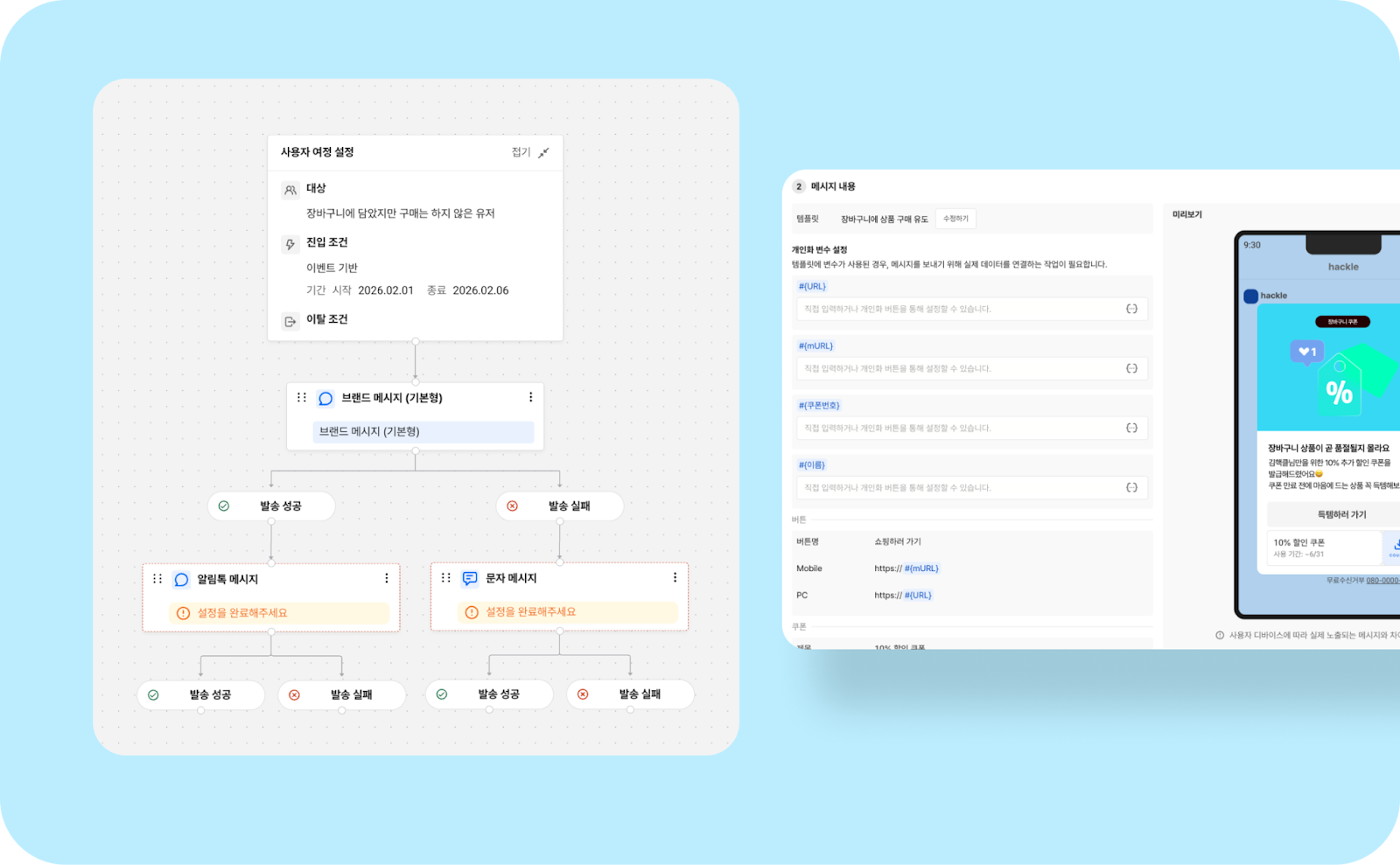 고객이 메시지를 클릭해 프로모션 페이지로 유입 → 장바구니에 상품을 담기 → 쿠폰 발급 완료 까지 완료 했다면 이제 남은 건 1주일 안에 구매 전환을 유도하는 후속 메시지 설계하는게 핵심이에요.