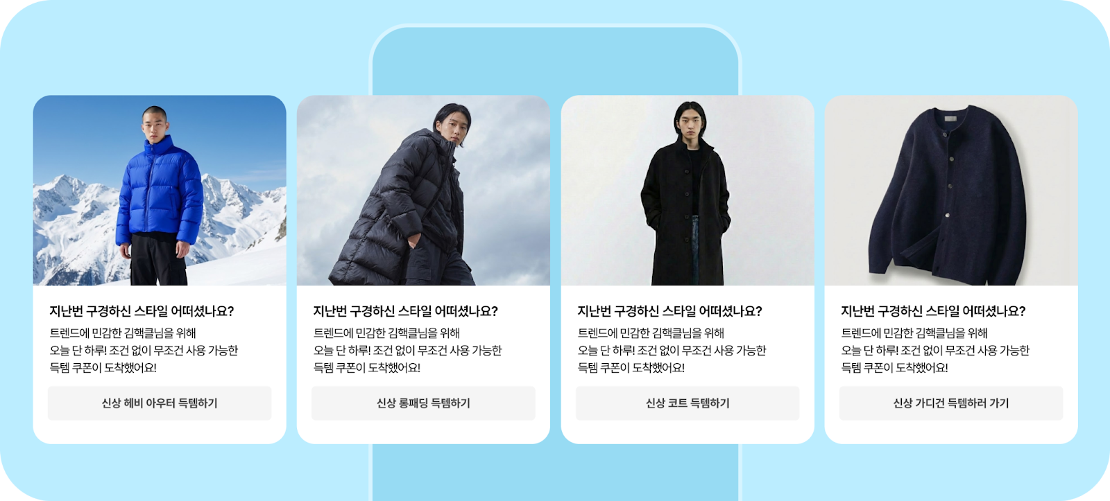 CTA 버튼에는 코트 / 숏패딩 / 롱패딩 / 가디건 등 여러 아우터를 노출시켜 취향 수집 → 반응 기반 분류까지 연결할 수 있어요.
